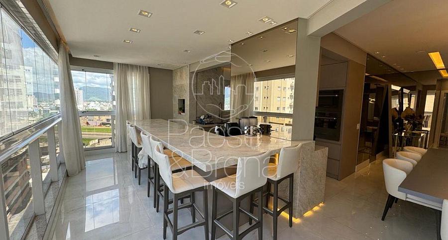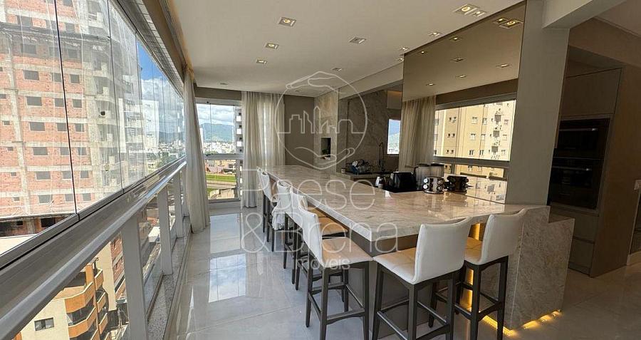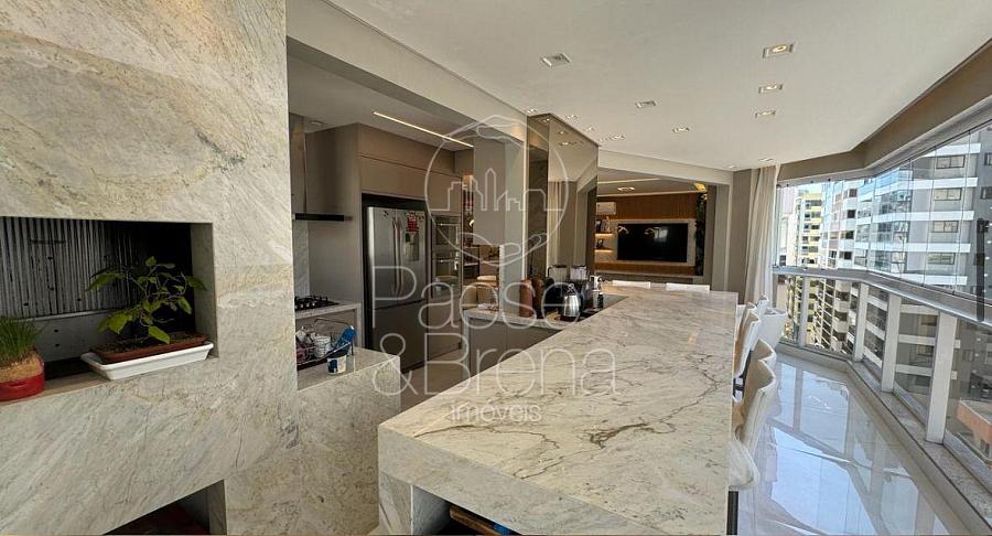 A sacada fechada com churrasqueira a carvão complementa o espaço, criando uma extensão natural da área social e permitindo aproveitar a vista e a brisa do mar durante o ano inteiro.